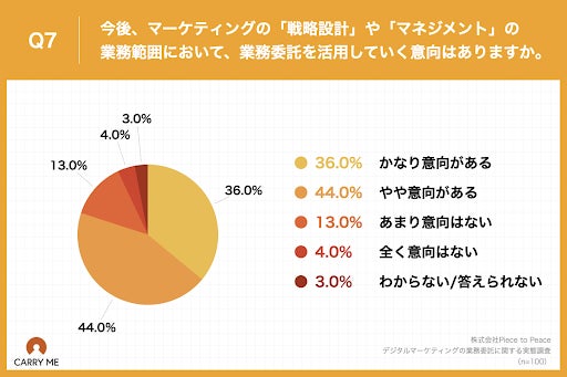 「Q7.今後、マーケティングの「戦略設計」や「マネジメント」の業務範囲において、業務委託を活用していく意向はありますか。」(n=100)と質問したところ、「かなり意向がある」が36.0%、「やや意向がある」が44.0%という回答となりました。