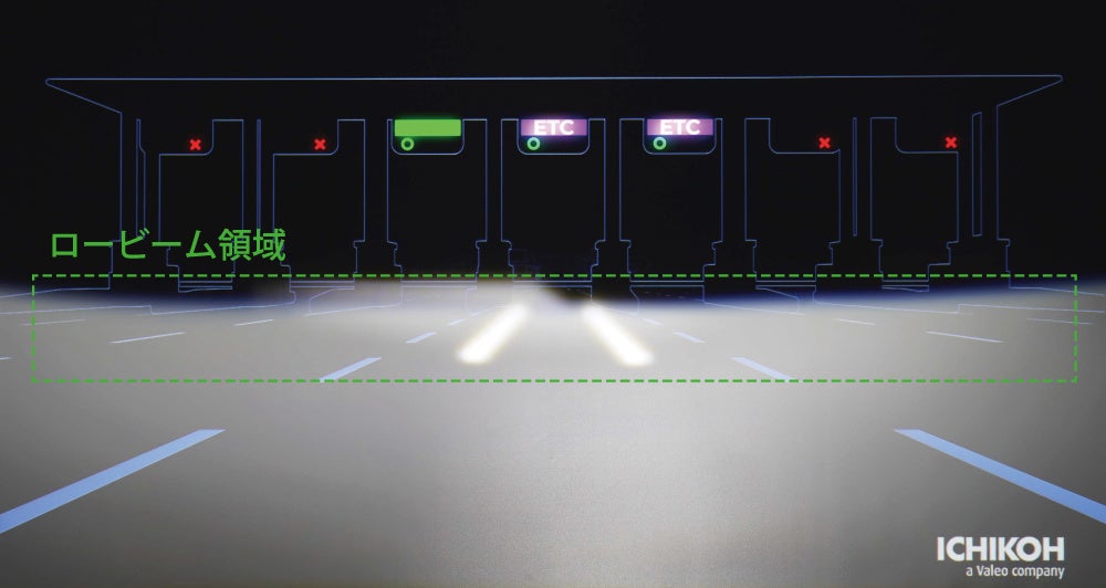 ロービーム領域では、路面に線や記号を照射することで、ドライバーにレーンガイドやナビゲーションといった情報を表示して運転を支援し、横断する歩行者の足元を強調して照らすことで、歩行者の発見を早め、安全性を高めます。