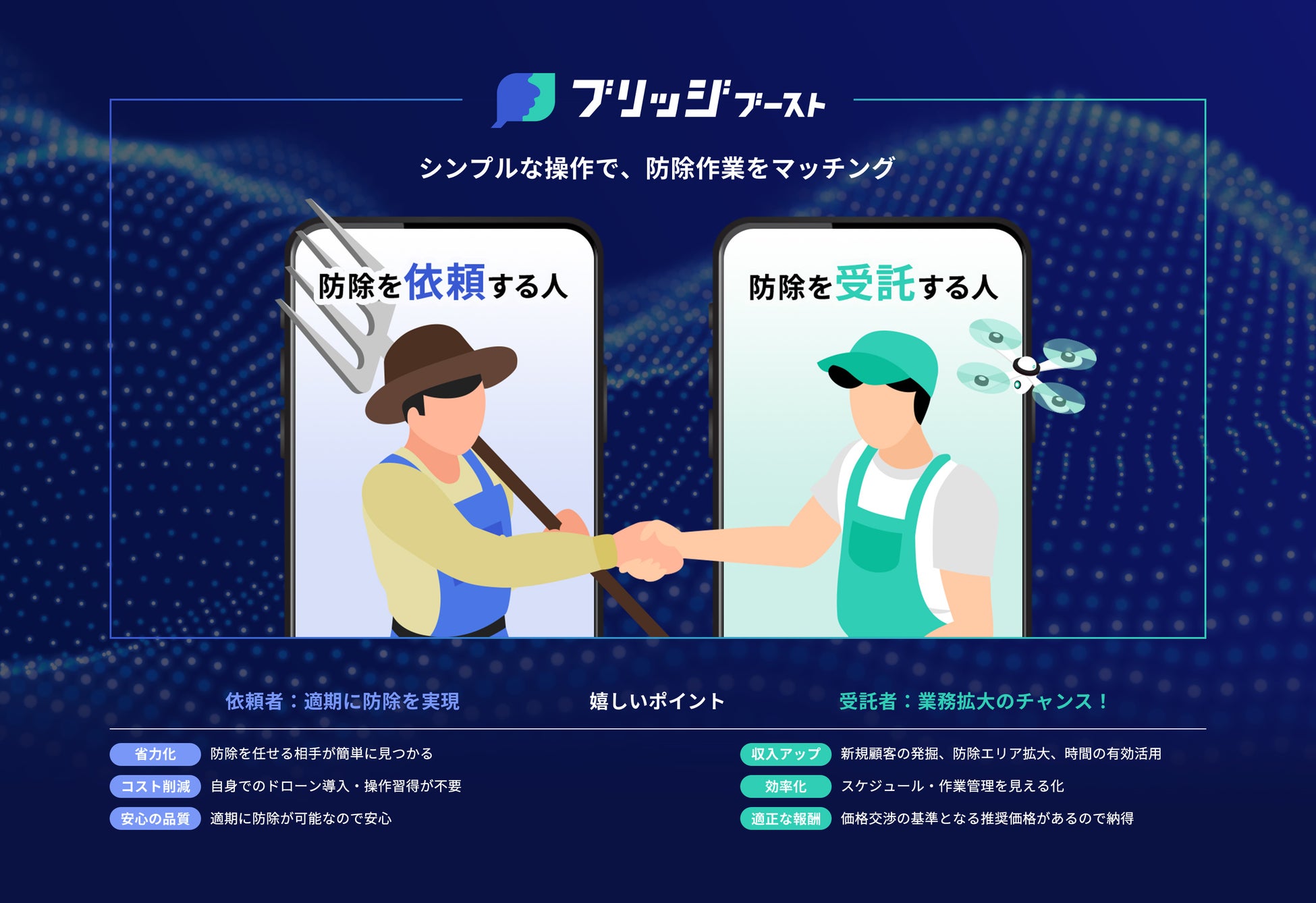 農作業マッチングサービス「ブリッジブースト」は、農作業を「依頼する人」と「受託する人」をつなぐマッチングサービスです。オンライン上で、マッチング、農作業の依頼・受託、スケジュール管理、作業管理、決済まで、一元的に提供します。第一弾として、「ドローンによる防除作業」をターゲットとし、サービスを開始します。これにより、依頼者は適期に防除を外注することができ、受託者は業務を拡大することにつながります。