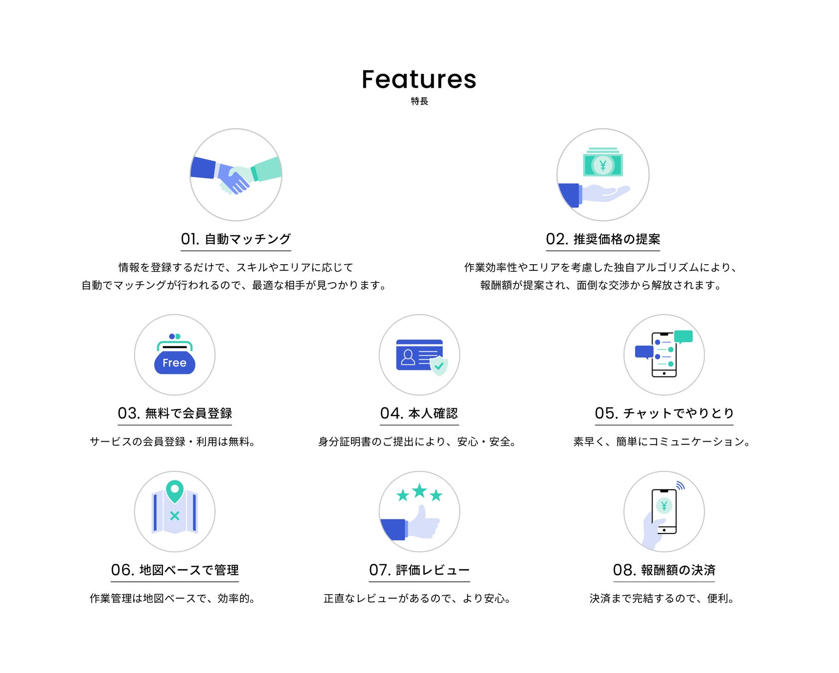 「ブリッジブースト」では、安心・安全なマッチングにこだわっています。独自アルゴリズムによる「自動マッチング」と「推奨価格の提案」が、特徴です。条件に応じた自動マッチングを実現し、作業効率性やエリア特性を考慮した推奨価格を提案します。お互いに最適な相手を見つけることができ、想定外の価格交渉からも解放されます。さらに、登録時の事前本人確認や事後評価レビューを導入しているので、安心して利用できます。