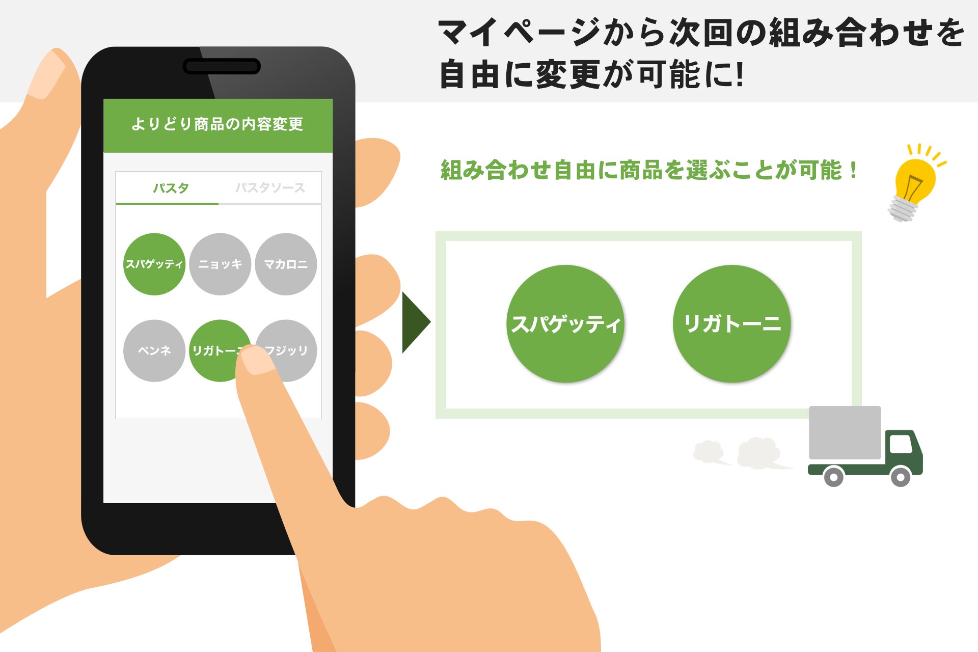 定期コースに対応したことにより、消費者は次回のお届け日までに自由に別の商品の組み合わせを選ぶことが可能。