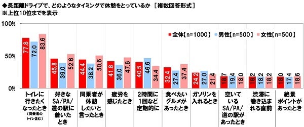 - 長距離ドライブでの休憩タイミング 1位「トイレに行きたくなったとき」2位「好きなSA/PA/道の駅に着いたとき」