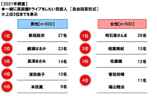 - 一緒に長距離ドライブをしたい芸能人 男性回答1位「綾瀬はるかさん」、女性回答1位「明石家さんまさん」