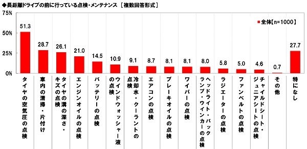 - 長距離ドライブの前に行っている点検・メンテナンス 「タイヤの空気圧の点検」は51%が実施