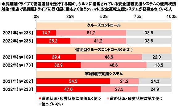 昨年の調査結果と比較すると、クルーズコントロールでは「道路状況・疲労状態に関係なく使う」が2021年14.7%→2022年25.2%と、10.5ポイント上昇しました。