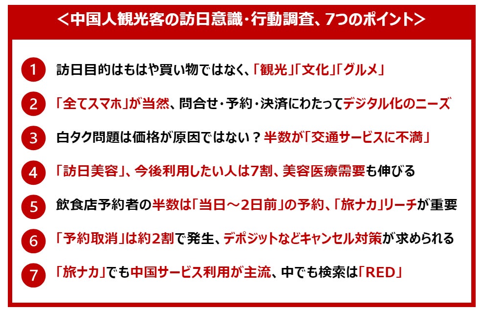 キャッシュレスサービスやオンライン配車/飲食店予約、デリバリーサービスが急速に普及した中国では、スマートフォンを使って簡単に各種サービスを利用することが一般的となっており、「日常生活のデジタル化」においては世界トップクラスの発展が起きています。そのため、海外に観光に出かける際にはその利便性とのギャップが強まっており、日本訪問時においても期待値を下回ってしまうケースが多々見られています。