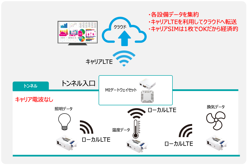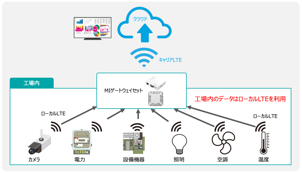 1.工場内のデータはローカルLTEで集約。クラウドへは一枚のSIMでデータ転送、ランニングコスト低減。