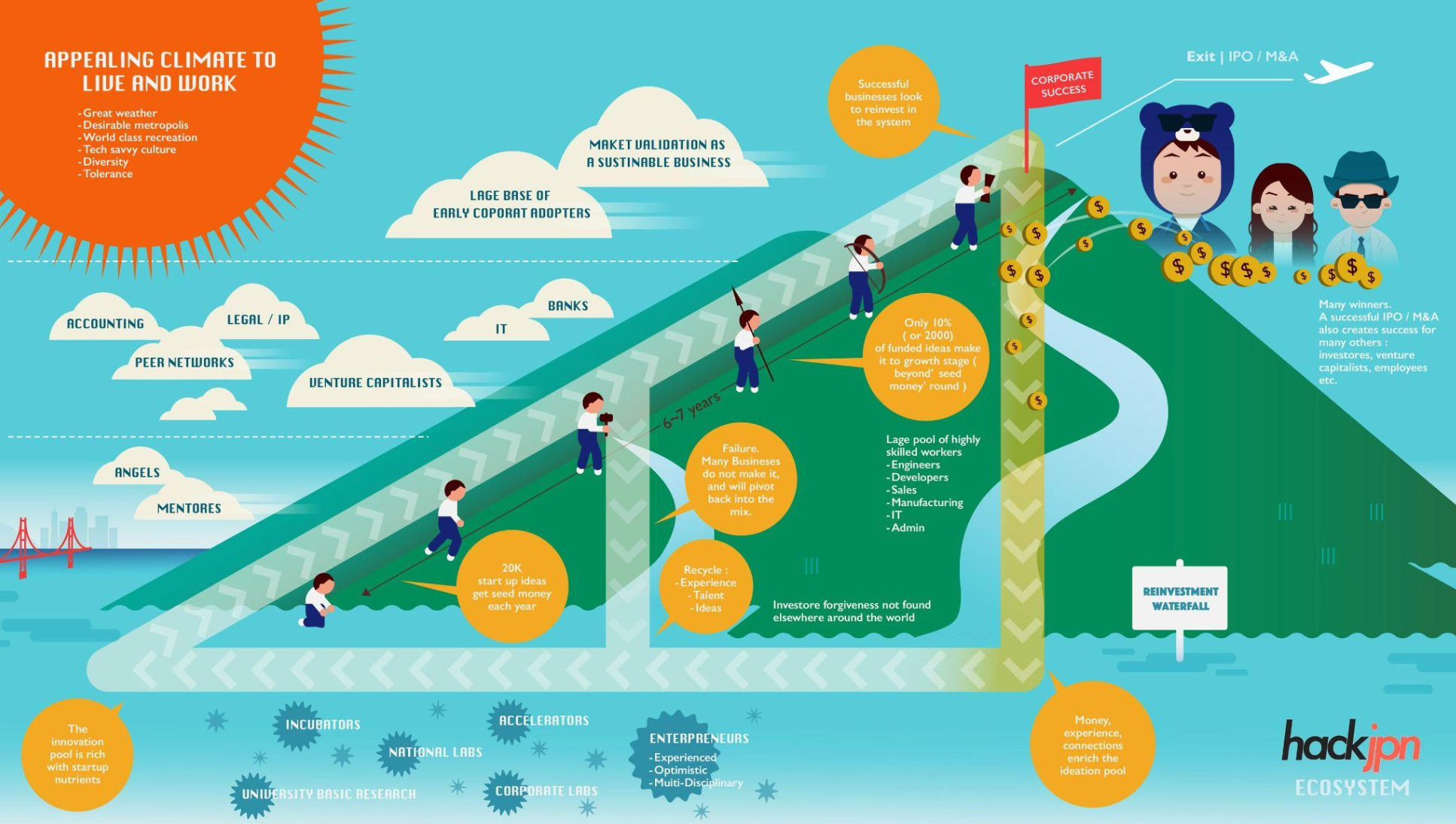 日米の起業率、廃業率を比較しても、日本の2倍近い数字を米国がだしており、起業家の失敗を金融機関が許容することで何度でも再挑戦ができる、起業しやすい土壌がカルチャーとなっています。私たちhackjpnは起業率の増加、ならびにベンチャー投資額を引き上げるとともに我が国のGDP20%の引き上げを目標とします。
