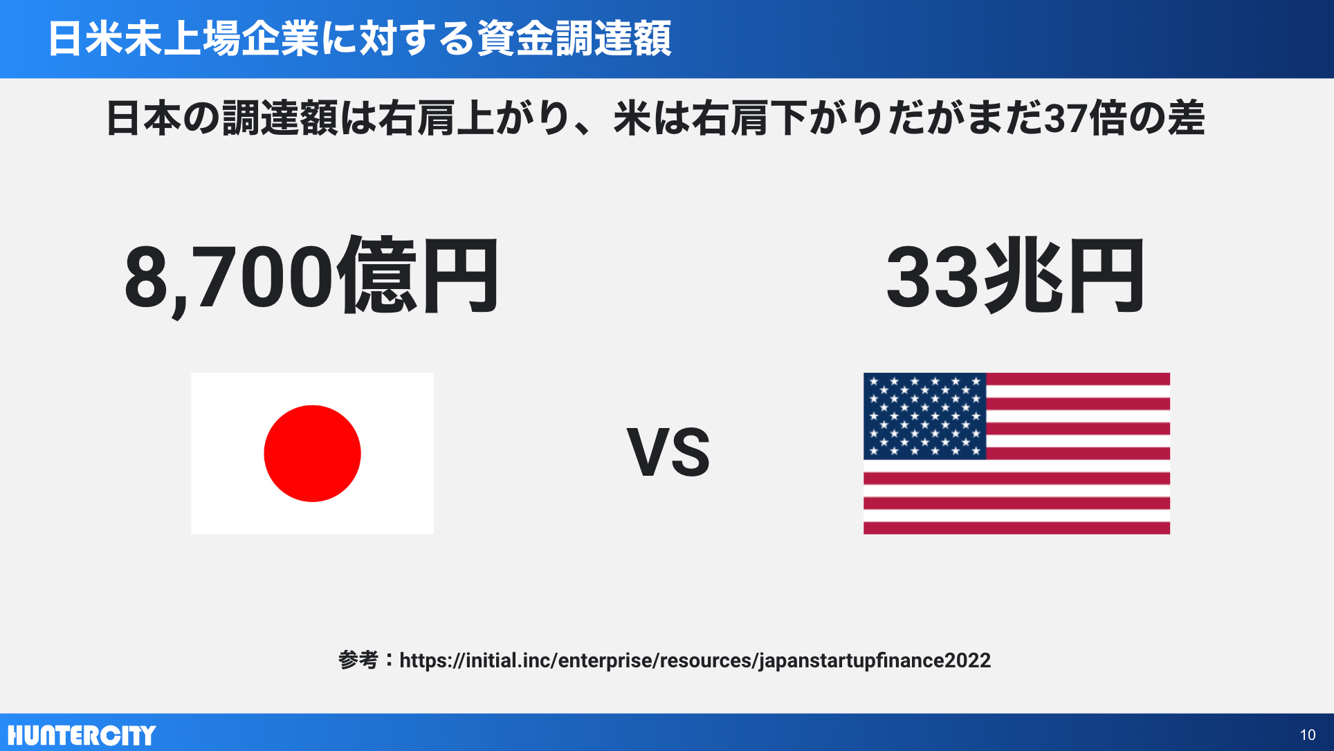 米国では年間GDP0.2%も満たないベンチャー投資額がGDP21%を引き上げ、雇用全体の11%をベンチャー企業が担っているという数字があり、ベンチャー企業の創出が国力を引き上げる鍵となっております。そのため創業期から上場までの支援が国策としても充実しており、ベンチャー投資額は我が国が8700億円に対して、米国が33兆円と約40倍もの差が開いております。
