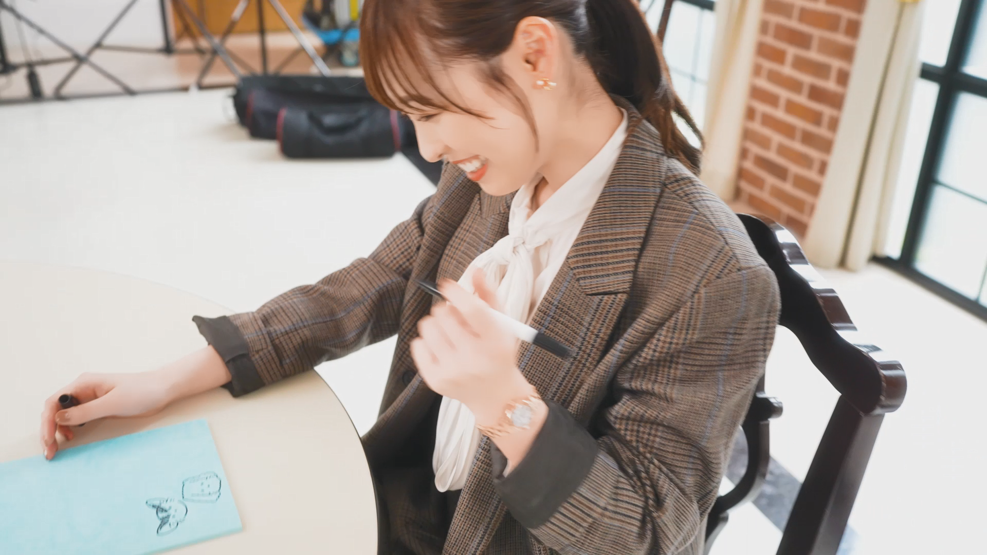 台本の裏面に、熱心に何かを描いている福原さん。覗き込むと、福原さんの愛犬(チワワとトイプードル)のイラストが。「よし、できた」と無邪気な笑顔でこちらを見上げます。つかの間の休憩時間にも、愛犬を思い出して癒された様子の福原さん。撮影が再開し、スタッフに声を掛けられると一瞬でお仕事モードにチェンジ。