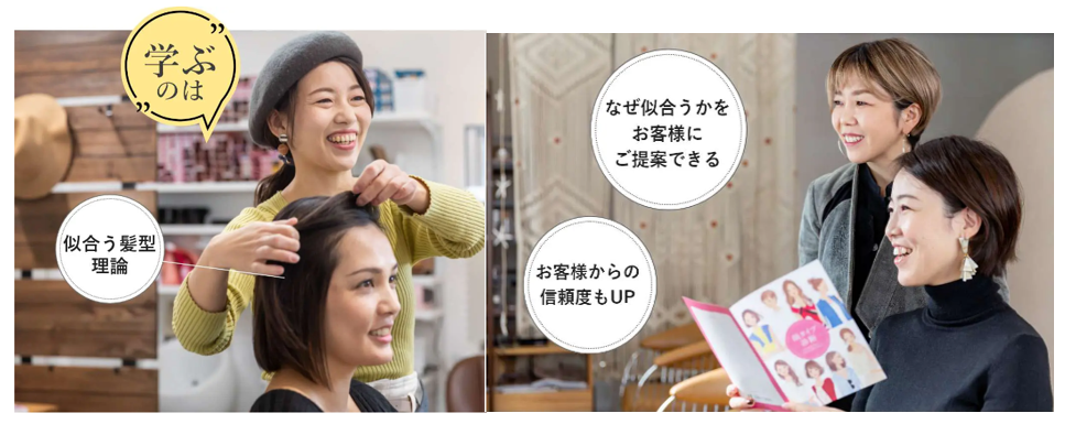 「似合う髪型」の定義は言語化されておらず、従来は、経験とセンスでしか「似合う髪型」を習得することができませんでしたが、「顔タイプ診断®」では、「理論」で似合う髪型を学ぶことができるため、スタイリストデビューをして間もないスタッフでも的確な「似合う髪型」を提案することができます。