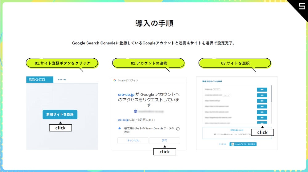 Google Search Consoleのアカウントを登録している場合は、saki-coの登録画面にてアカウント連携していただくだけで簡単に設定できます。