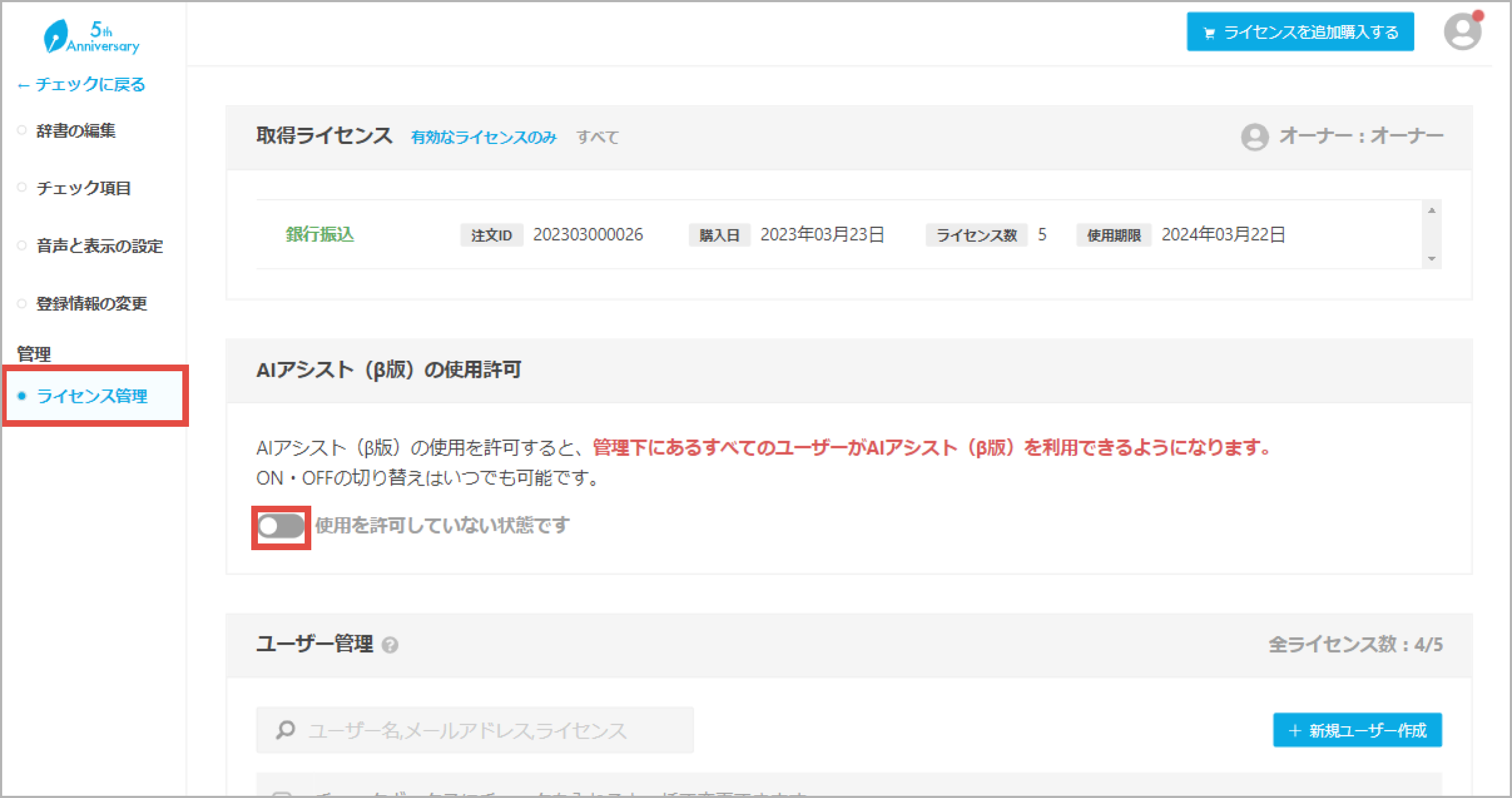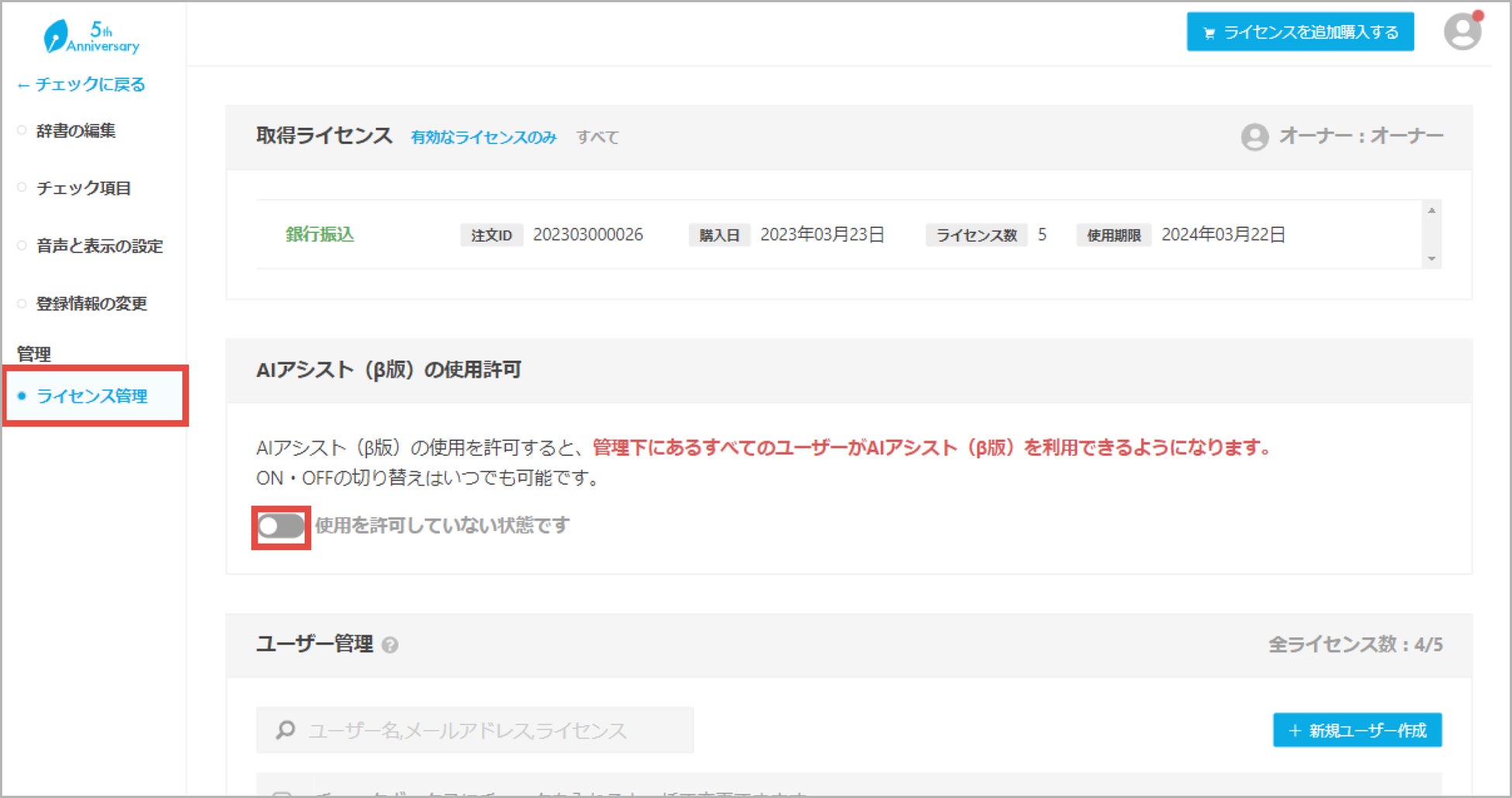 オーナーが使用を許可しなければ、ユーザーはAIアシスト(β版)を使用できません。