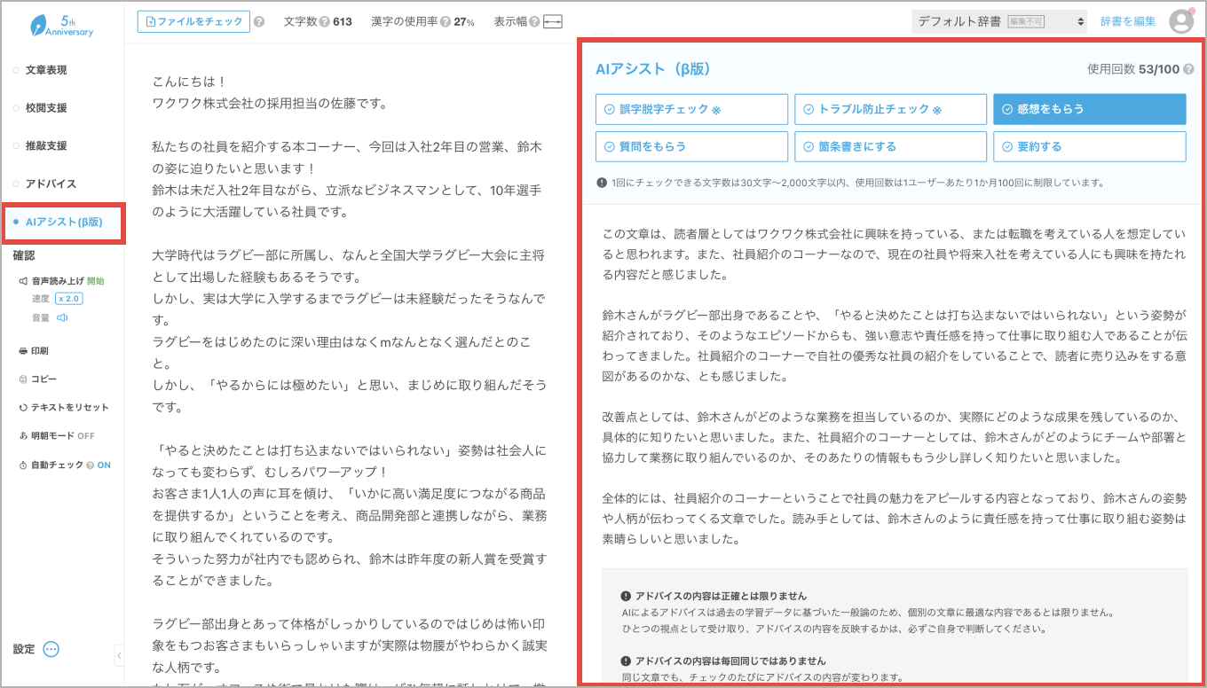 ※校閲支援とAIアシスト(β版)の誤字脱字検出は異なる技術を使用しています。
