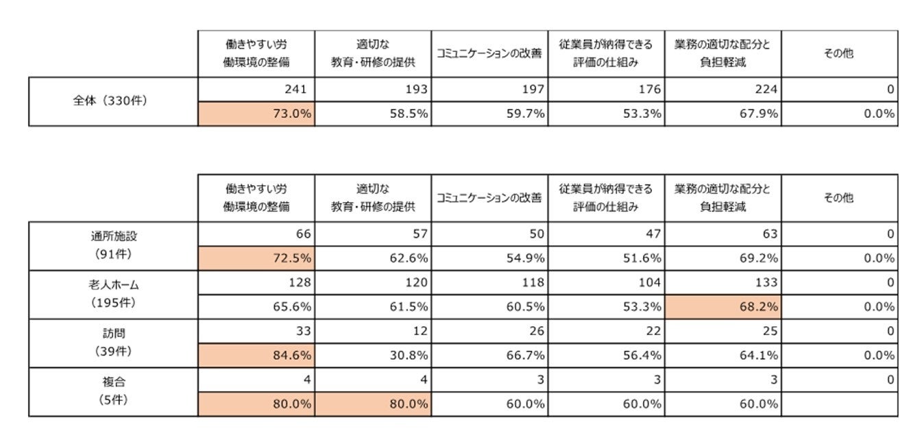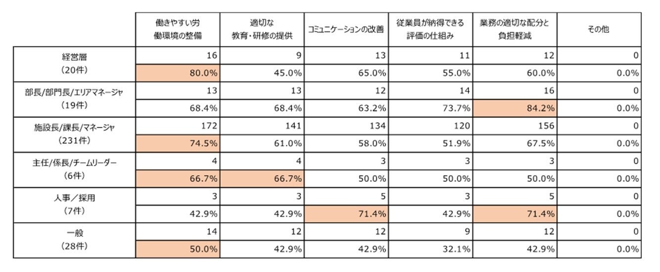全体でも施設別でも「働きやすい労働環境の整備」および「業務の適切な配分と負担軽減」を必要であると考えていることが分かりました。