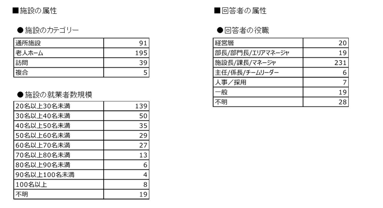 本調査では全国の330施設330名の回答を得ることができ、得られたデータは介護福祉施設における課題について考察するための貴重な資料となりました。回答者の属性や施設の特性についても詳細な情報が取得でき、今後の介護施設の運営や改善に向けて有益な示唆を得られるものと考えております。