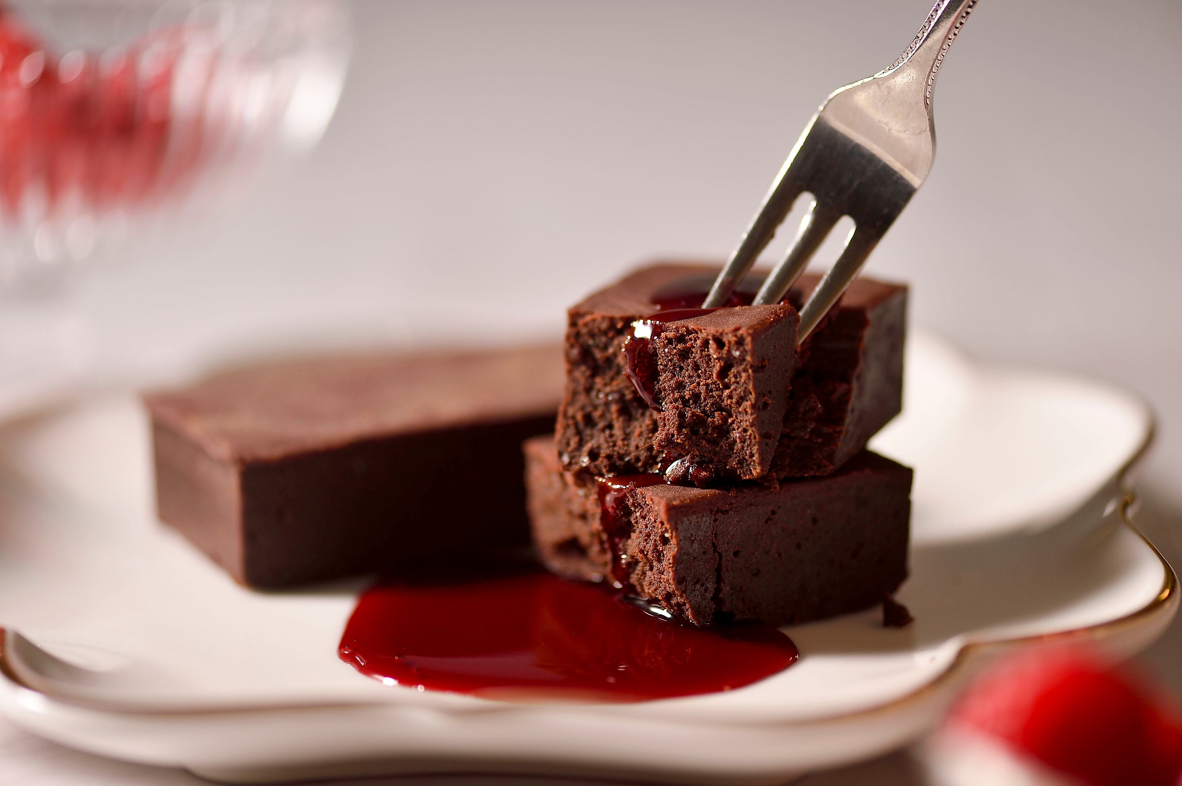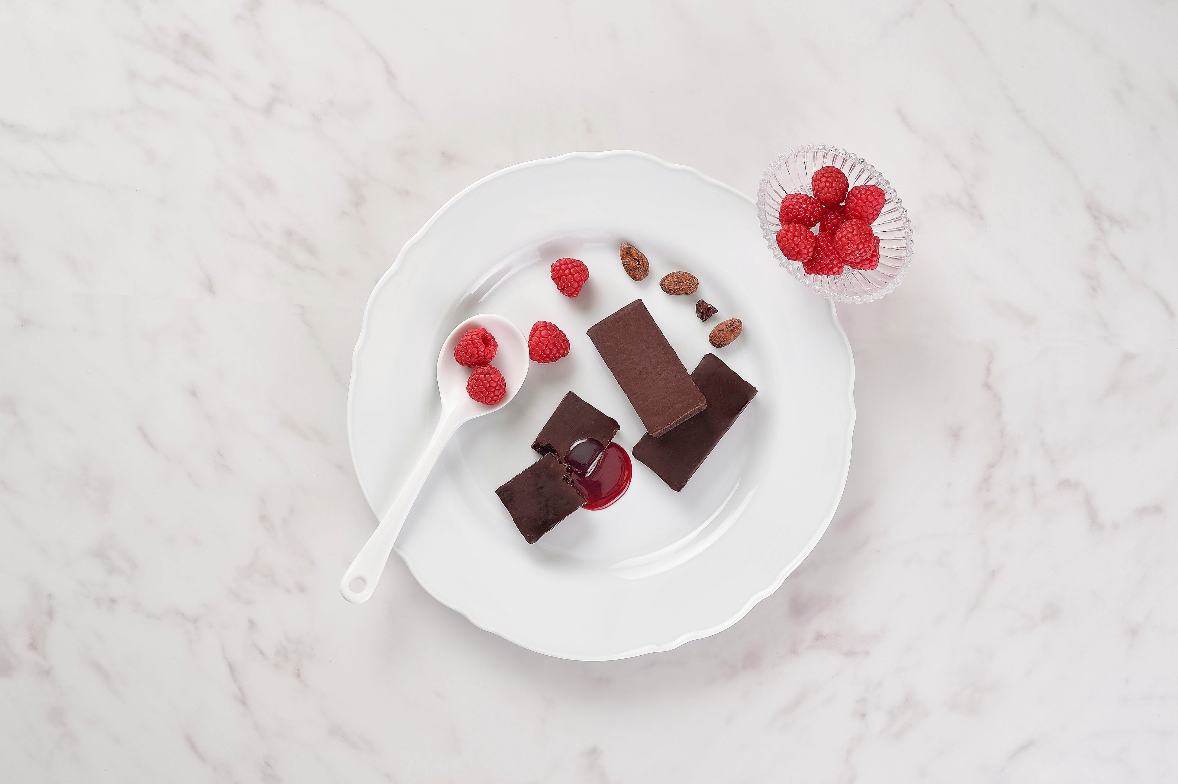 トップのチョコソースには「くるみ」を使用せず、チョコレート本来のピュアな風味とビターな大人の味わいを演出。お好みで、同梱されている「ラズベリーソース」を掛けて、フルーティーな横濱煉瓦をお楽しみいただくのもおすすめです。