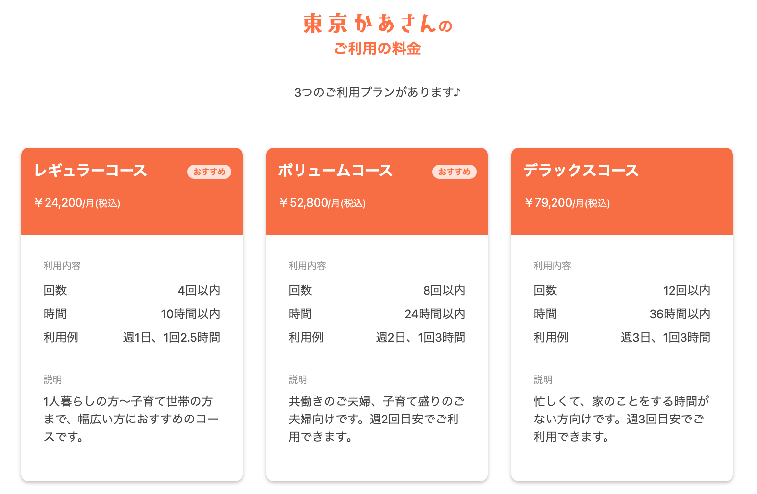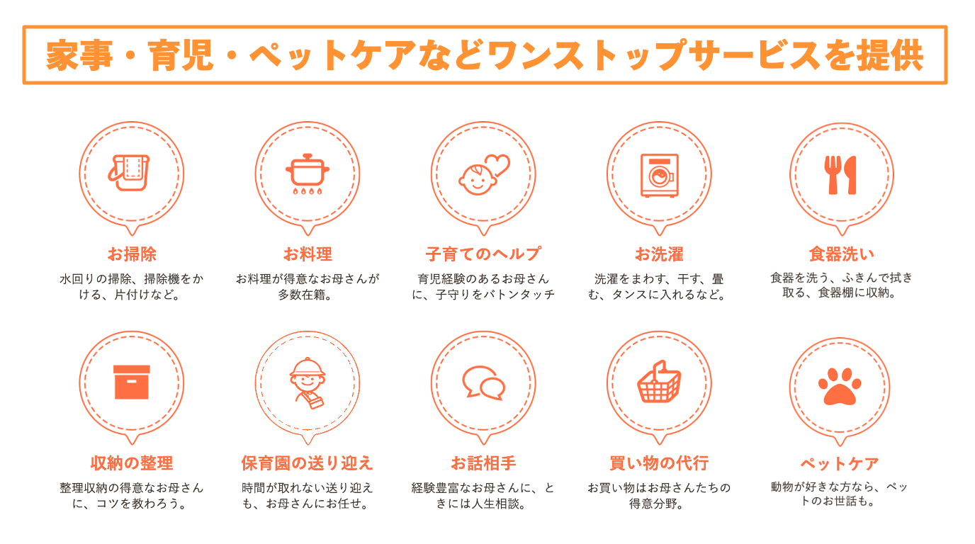“東京にもう1人のお母さんを” をコンセプトとしたおせっかいスタイルなご家庭サポートサービスです。熟練主婦が個人家庭に訪問し、家や育児のお手伝い。ときには料理や掃除のコツを教えたり、育児の悩み相談に乗ったり。まるで親子のような関係でサポートいたします。安心の定額制(サブスクリプション)で、お財布にも優しい。3つの料金プランからお選びいただけます。
