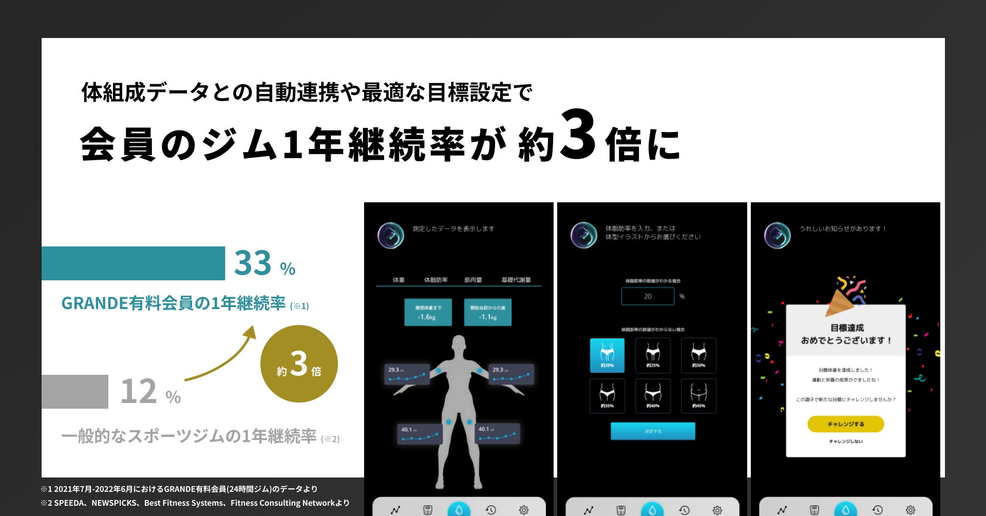 オーダーメイドサプリメントを自動抽出するだけではなく、業務用体組成機InBodyとの体組成データ自動連携や、体組成データや生活習慣を基にした配合提案、最適な目標設定など、専属のパーソナルトレーナーのようなアドバイスも行います。結果、会員の継続モチベーションを向上させ、GRANDEを利用するユーザは、一般的なスポーツジムの会員継続率に比べ、ジムの継続率が約3倍向上しています。