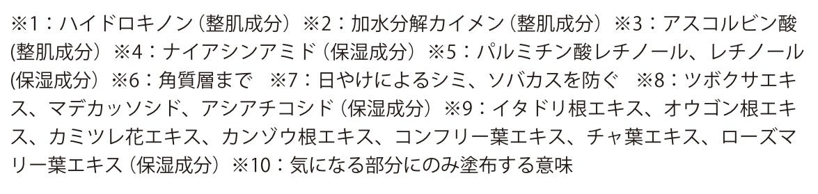 ※9:イタドリ根エキス、オウゴン根エキス、カミツレ花エキス、カンゾウ根エキス、コンフリー葉エキス、チャ葉エキス、ローズマリー葉エキス(保湿成分)