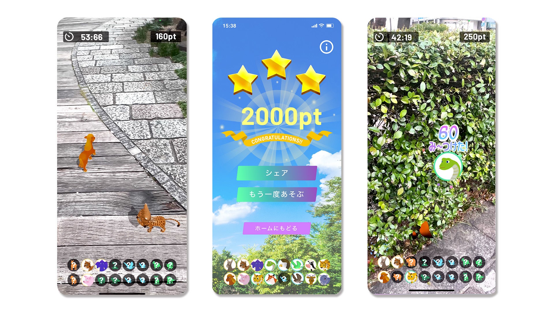 どうぶつをタップすると得点があがるというシンプルなルールなので、小さなお子様から大人までカジュアルに楽しんで頂けます。場所によって出てくるどうぶつも異なるので、色んな場所で遊んでみて下さい。