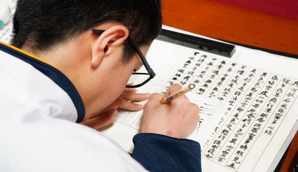 写経は、般若心経を唱え、墨を一から擦り、お手本のお経を下に敷いた状態からなぞり、般若心経を写し取ります。集中力を養います。