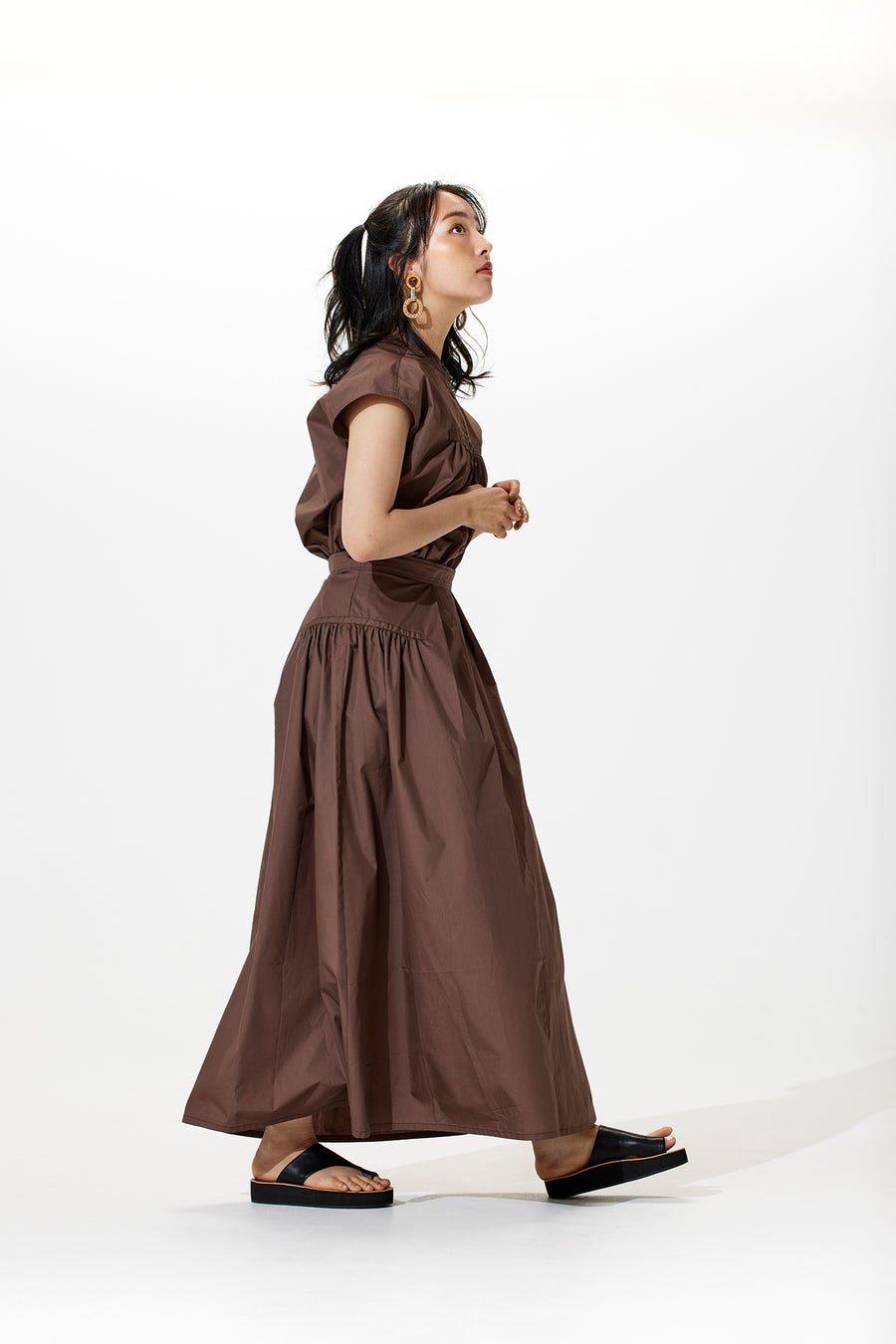 ハリ感のあるしっかりとした生地感で仕上げたシリーズは、ギャザーを随所に取り入れ立体感のあるシルエットが特徴です。カラーはcaféをイメージした深みのあるブラウンと夏の涼し気な雰囲気を盛り上げるブルー系での展開となります。