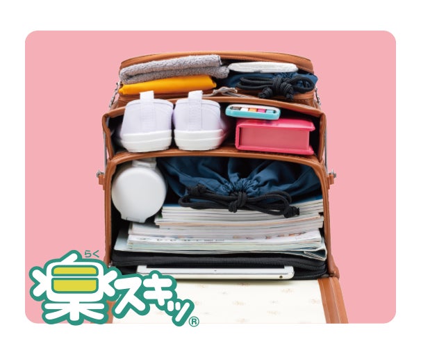 整理整頓しやすい大容量設計で毎日を応援。サブポケット+前ポケットまでたっぷり入る「楽スキッ」とメインポケットが13.5cmで大きめの水筒も入る「ワイド」の2つの大容量から選べます。 |
