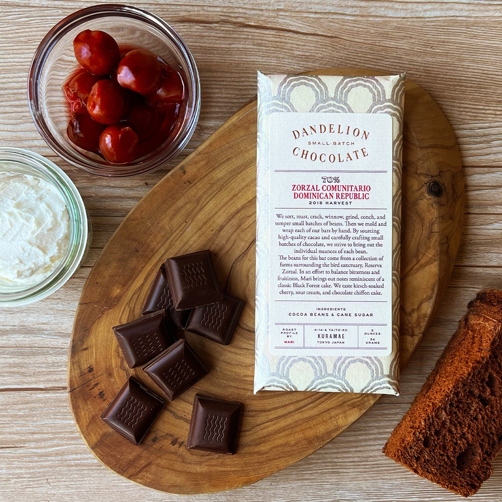開発を担当したのは、ダンデライオン・チョコレートのプロダクションチームで長く働く土屋まり。イメージはドイツの伝統菓子「フォレノワール」(キルシュが染み込んだココアのスポンジ生地に生クリームをサンドし、表面に削ったチョコレートとさくらんぼを飾ったケーキ)。フレーバーノートである「キルシュ漬けしたチェリー、サワークリーム、チョコレートシフォンケーキ」からも、このケーキにあるそれぞれのパーツを、チョコレート一枚から感じ取ることができます。