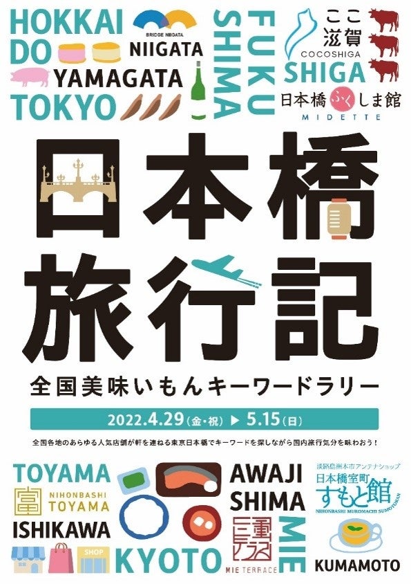 三井不動産商業マネジメント株式会社が運営するコレド日本橋とコレド室町は、日本橋エリアにあるアンテナショップ6店舗とともに、2022年4月29日(金・祝)~5月15日(日)の17日間、お買い物を楽しみながらキーワードを集めると、特産品などが当たる『旅気分を味わう「日本橋旅行記」全国美味いもんキーワードラリー』を行います。