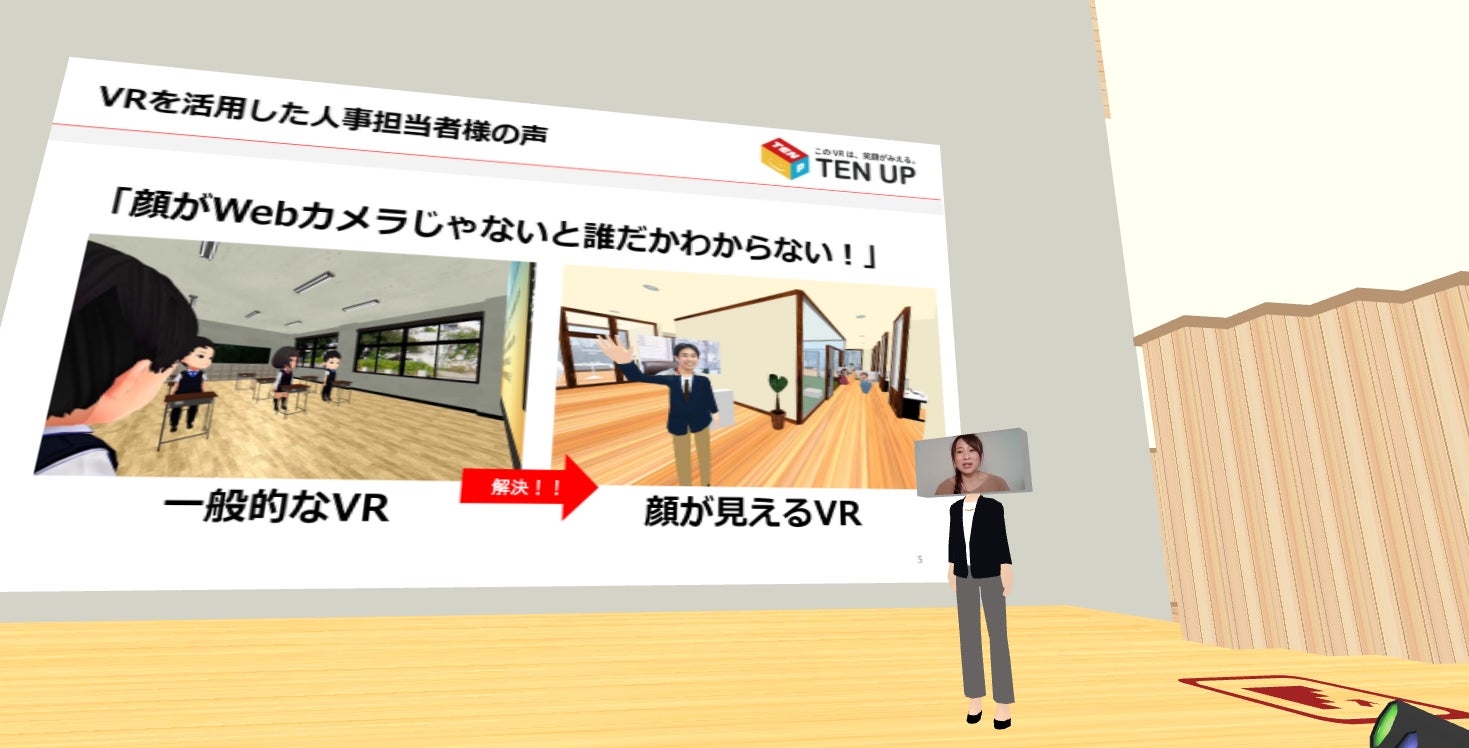 当社は2018年から新卒採用のツールとしてメタバース(VR)を推進しておりましたが、各企業人事ご担当者様から、「面白いが、学生(応募者)の顔が見えないと話にならない」との声をいただいており、今回の実証実験は、その課題を解決すべくアバターの顔の部分をWebカメラにした仕様にて実証実験を行いました。