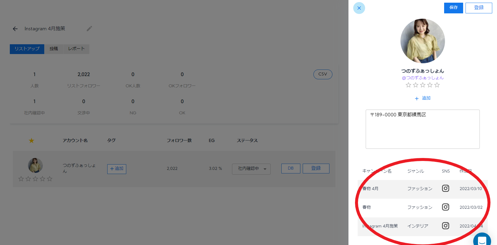 ④そのインフルエンサーの「過去の起用履歴」も一目で分かる