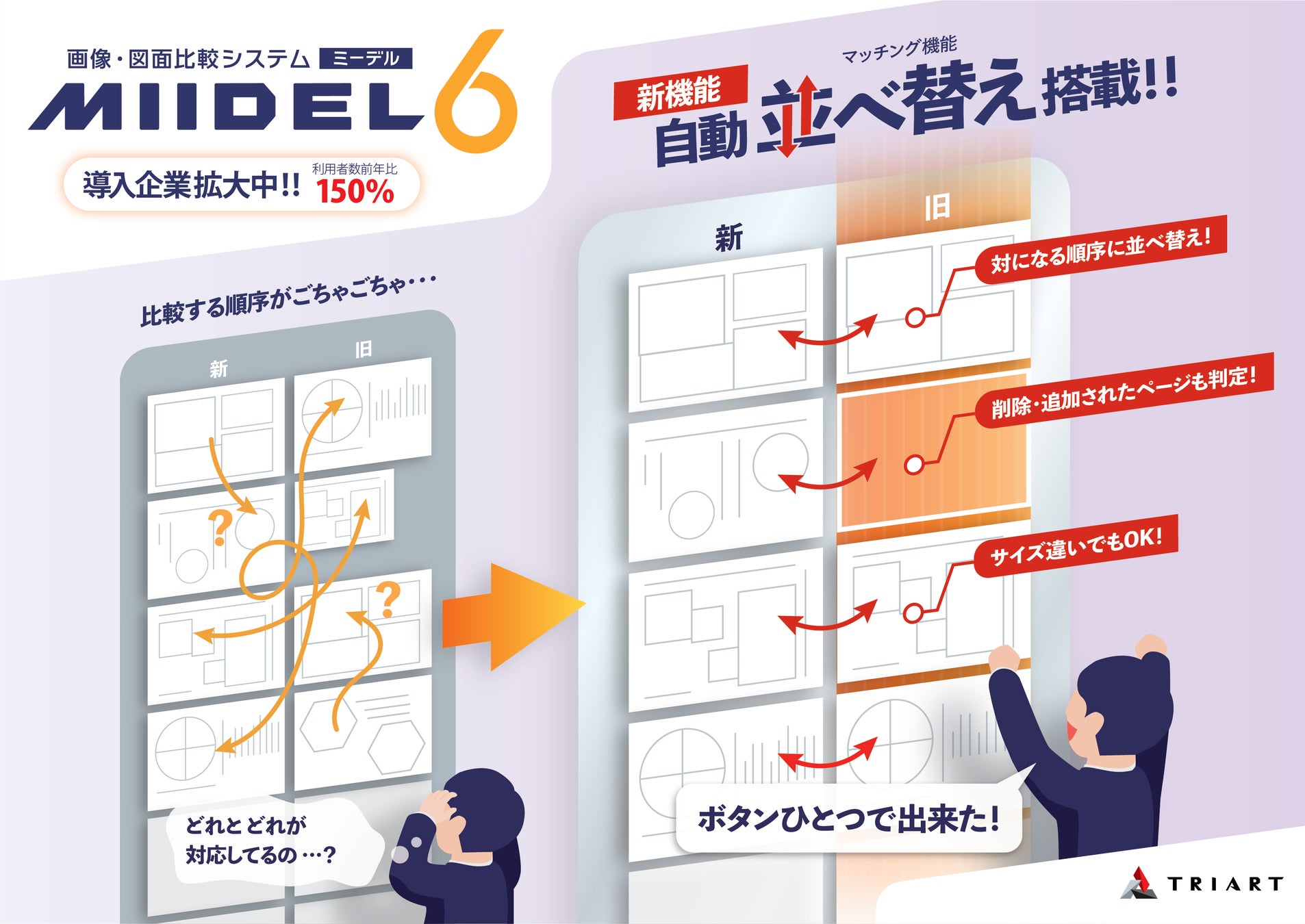 株式会社TRIART(トライアート、所在地:福岡県飯塚市、代表取締役:今津研太郎)は、画像・図面比較システムMIIDEL(読み:ミーデル)に新旧の対応ページを自動で発見して並べ替えるページマッチング機能などを搭載して大幅に改訂した新バージョン『MIIDEL6』を、2022年4月1日より提供開始しました。