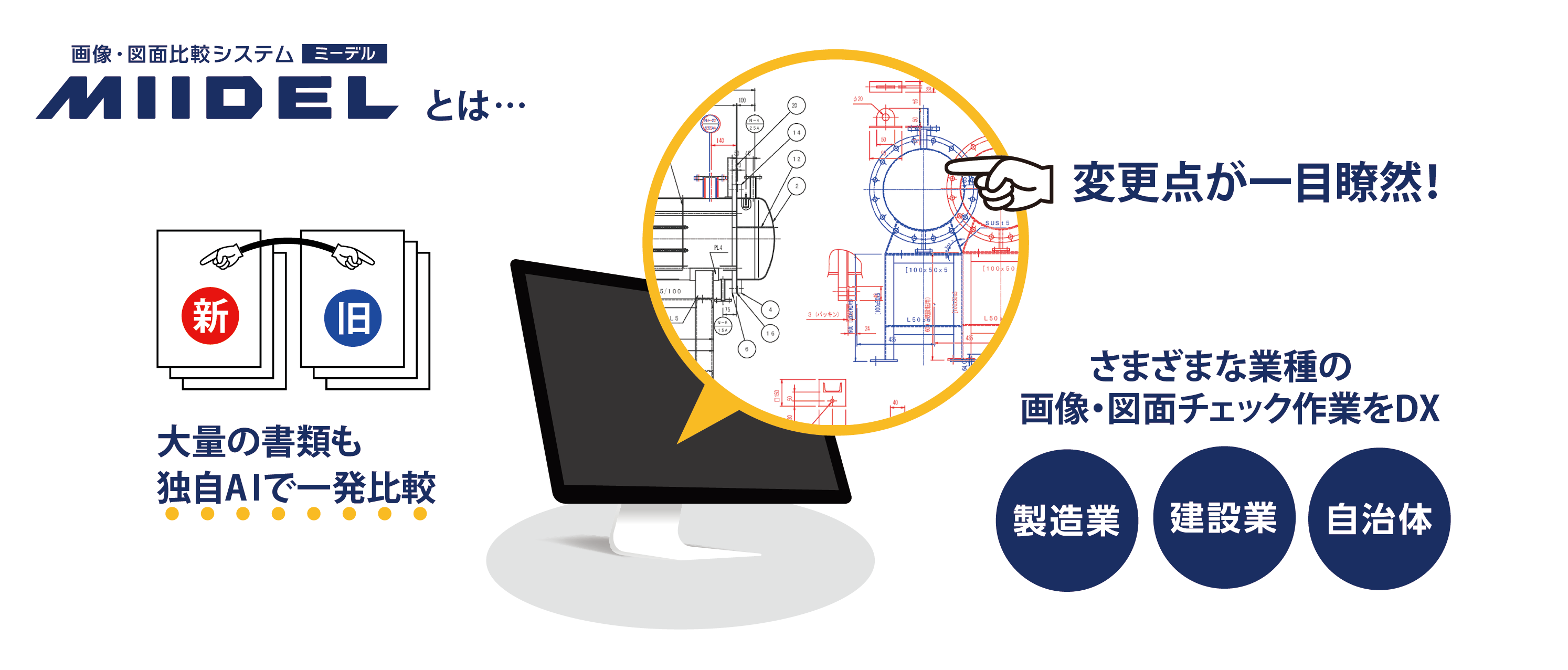 MIIDELは、書類の新旧比較や修正点チェックの作業において、目視では見落としがちな変更箇所も独自AIで瞬時に検出して差分を色別表示し、作業効率を大幅に向上させる「画像・図面比較システム」です。