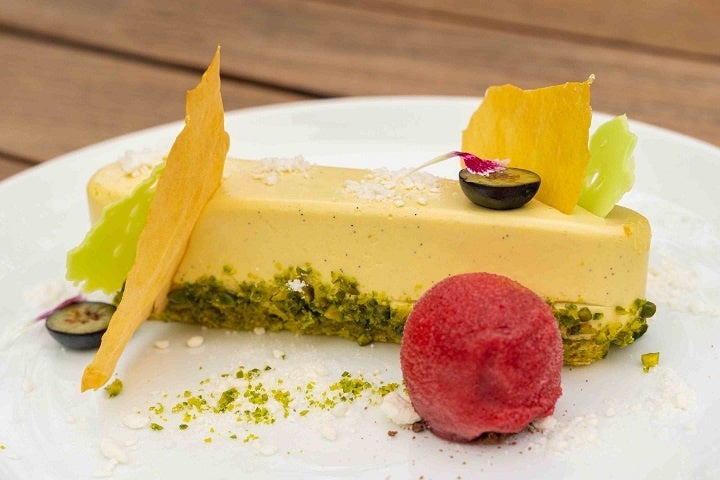 淡い緑が初夏を演出してライムの爽やかさ、ピスタチオの甘味とコクがマッチした味わいをお楽しみください。赤い実シャーベットを添えてご用意いたします。