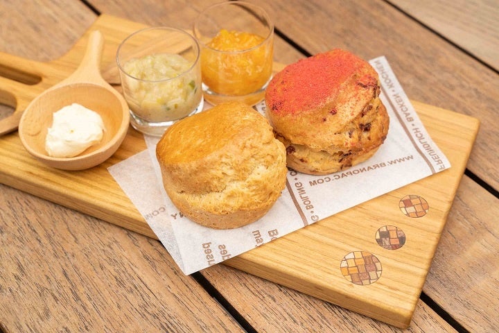 ペストリーシェフ風戸こだわりの焼きたてスコーンと季節のジャムは、今季から箱根の伝統工芸品「寄木細工」のデザインを施したカッティングボードでご提供します。この機会にぜひご賞味ください。