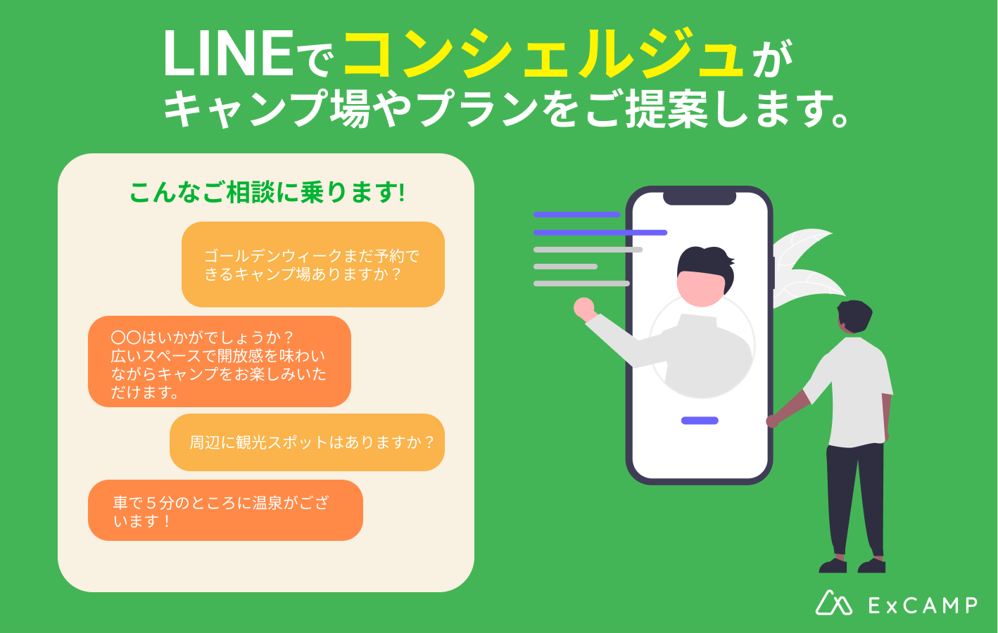 今回「ExCAMP」では、希望条件にあったキャンプ場をご提案するコンシェルジュサービスの提供を開始し、これから特に予約難易度が高まるキャンプシーズンのキャンプ場探しをサポートいたします。