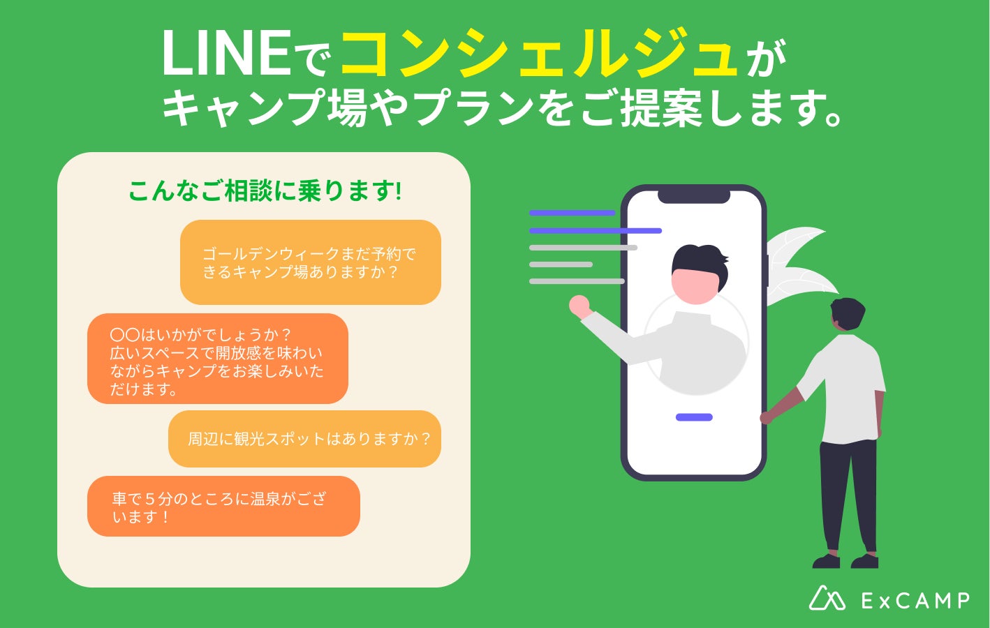 アウトドア特化の宿泊OTAサイト「ExCAMP(エックスキャンプ)」を運営するforent株式会社(所在地:茨城県つくば市、代表取締役:塚﨑浩平)は、4月9日より、LINE@を活用した、キャンプ場検索のコンシェルジュサービスを開始いたしました。条件にあったキャンプ場を担当者からおすすめし、予約の取りにくいゴールデンウィークシーズンのキャンプ準備をサポートいたします。