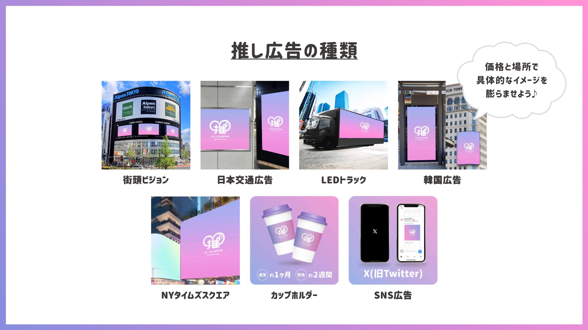 「推しを応援したい!」「推しの誕生日や記念日をお祝いしたい!」という思いを持ったファンが、自発的に応援目的の広告を出しており、街中の街頭ビジョンやバス停・地下鉄などの交通広告、カフェを貸し切ったカップホルダーイベントなど、様々な形で広告が掲出されています。