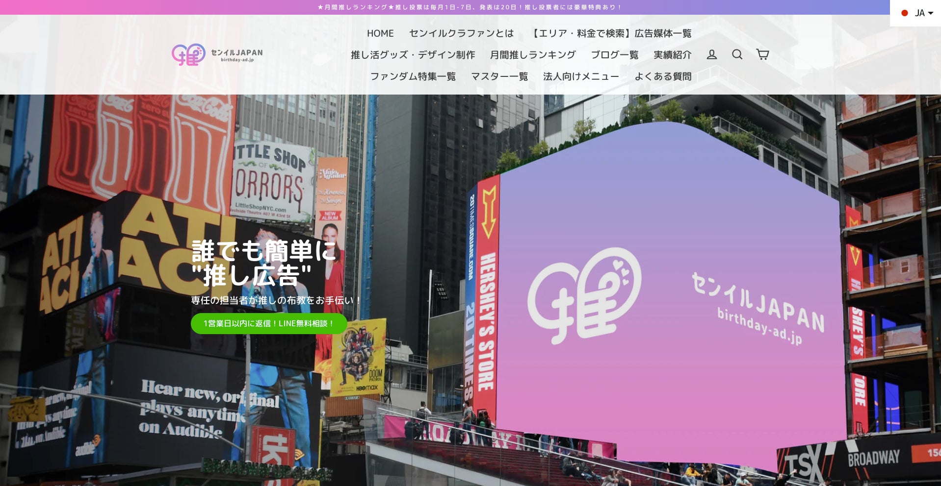推し広告は、市場ではセンイル広告(誕生日広告)や応援広告とも呼ばれていますが、弊社では推し広告という呼称に統一しています。