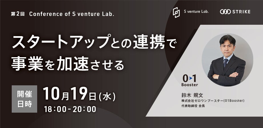 株式会社ストライク(本社:東京都千代田区、代表取締役社長:荒井邦彦)はスタートアップ企業と事業会社の提携促進を目的とした会員制サービス『S venture Lab.』を運営しております。9月に大盛況のうちに終わった本イベントの2回目となる今回は、(株)ゼロワンブースター(01Booster)の鈴木規文代表取締役会長をお招きし「スタートアップとの連携で事業を創造する」をテーマとしたトークセッションを行います。また前回同様、スタートアップ各社によるピッチも実施致しますので、奮ってのご参加をお待ちしております。
