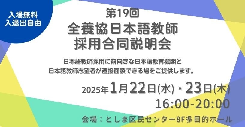 全養協では2025年1月22日(水)、23日(木)の2日間にわたり第19回日本語教師採用合同説明会を開催します。日本語教師採用に前向きな日本語教育関係者の皆様と日本語教師を志望する皆様が直接面談できる絶好の機会です。多くの方々のご参加をお待ちしています。