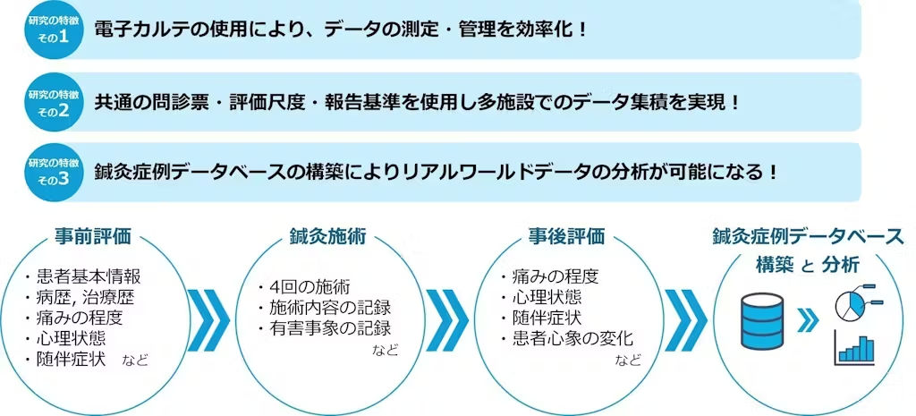 「鍼灸症例データベース研究」では、リピクルを活用し、開業鍼灸院に訪れる筋骨格痛(筋や関節の痛み)患者の症状の変化や施術情報など詳細なデータ収集が試みられます。