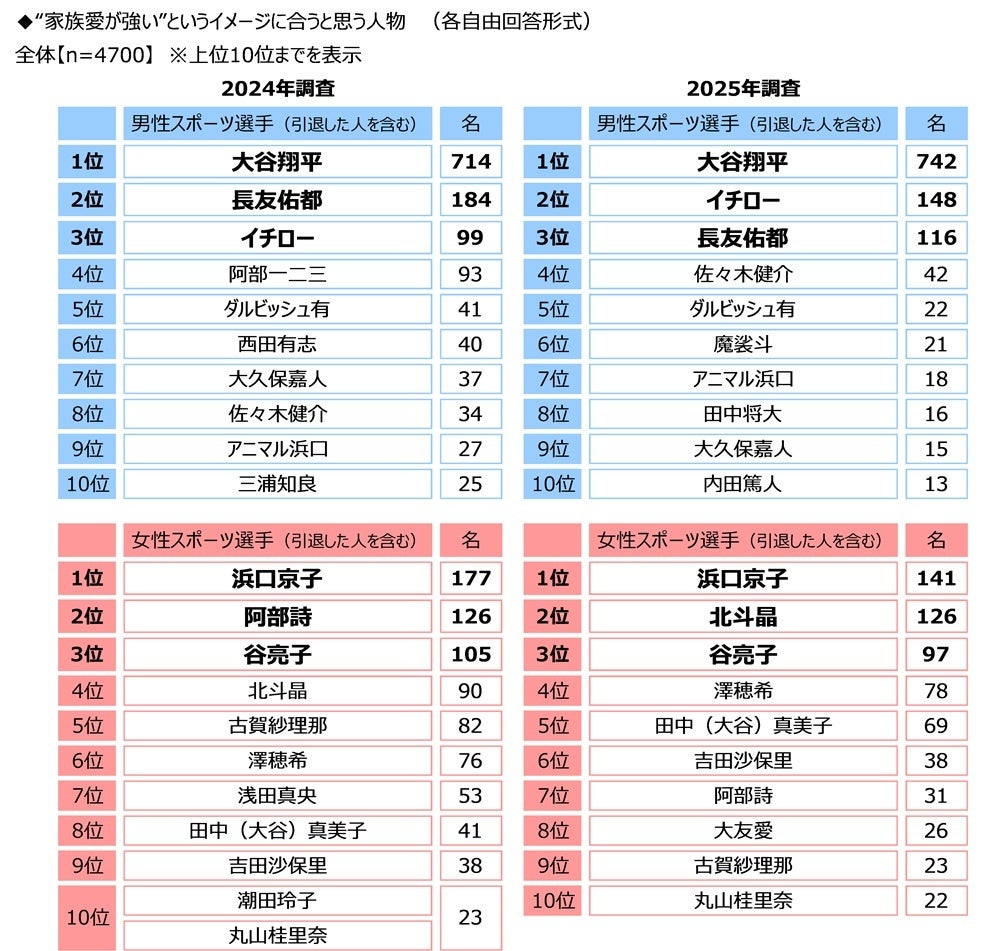 “家族愛が強い”というイメージに合う【スポーツ選手(引退した人を含む)】についてみると、男性スポーツ選手では「大谷翔平さん」(742名)がダントツとなり、2位「イチローさん」(148名)、3位「長友佑都さん」(116名)と続きました。女性スポーツ選手では1位「浜口京子さん」(141名)、2位「北斗晶さん」(126名)、3位「谷亮子さん」(97名)となりました。