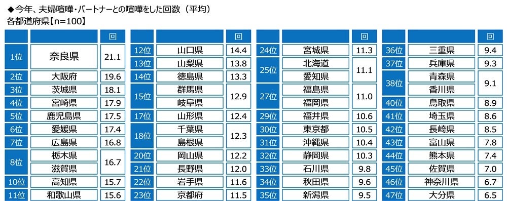 都道府県別にみると、喧嘩をした回数の平均は、奈良県(21.1回)が最も多くなり、大阪府(19.6回)、茨城県(18.1回)、宮崎県(17.9回)、鹿児島県(17.5回)が続きました。また、最も少なくなったのは大分県で、6.5回と全体の平均の約半分となりました。