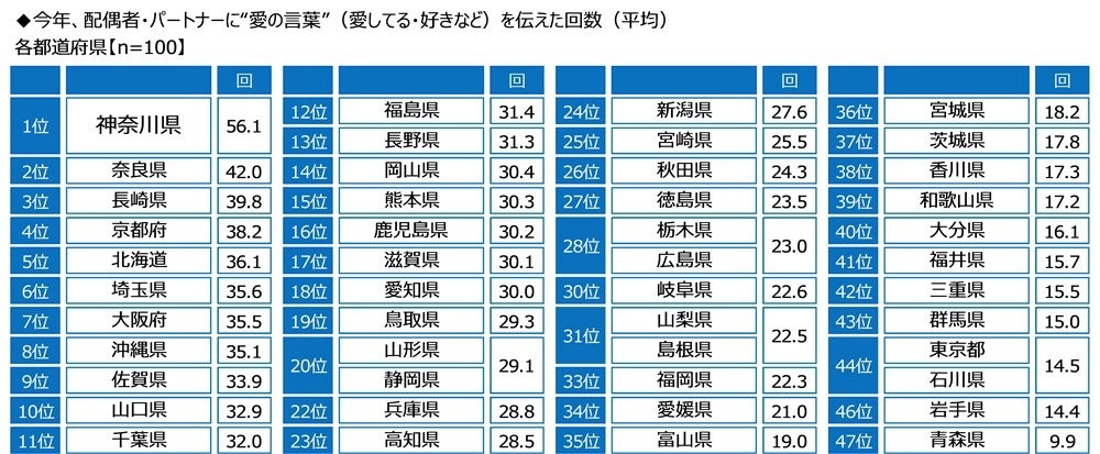 都道府県別にみると、“愛の言葉”(愛してる・好きなど)を伝えた回数の平均は、神奈川県(56.1回)が突出して多くなり、50回以上でした。以降、奈良県(42.0回)、長崎県(39.8回)、京都府(38.2回)、北海道(36.1回)が続きました。