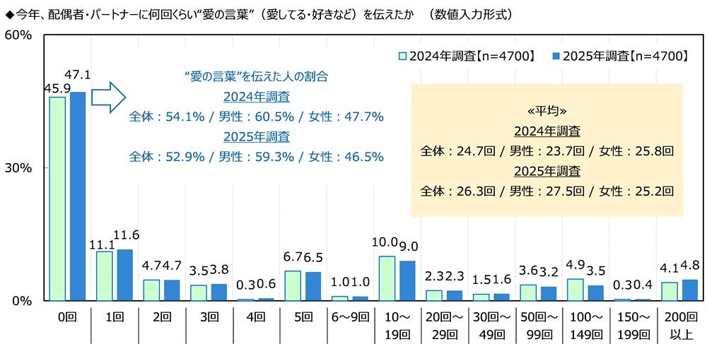 今年、配偶者・パートナーに“愛の言葉”を伝えた回数 平均は26.3回、恋人タイプでは79.1回