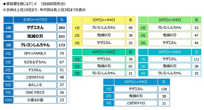 年代別にみると、全年代で「鬼滅の刃」(20代36名、30代47名、40代62名、50代38名、60代38名)が2位となりました。現在、劇場版シリーズも公開中の「鬼滅の刃」は、家族愛を感じる作品として全年代から人気のようです。30代以下では「クレヨンしんちゃん」(20代49名、30代53名)が1位、40代以上では「サザエさん」(40代76名、50代111名、60代129名)が1位となりました。また、60代では「となりのトトロ」(21名)が3位となりました。