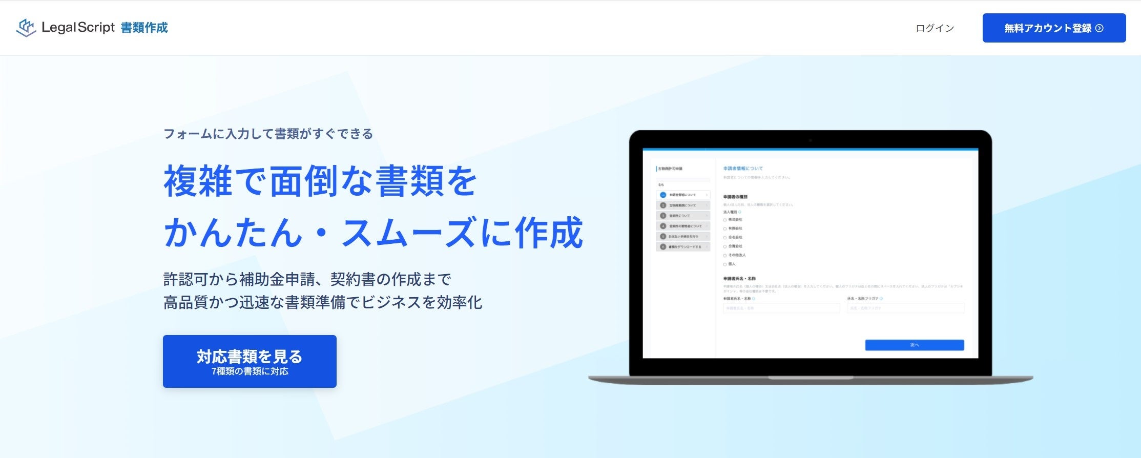 事業内容 :登記書類作成支援サービス『LegalScript』、特定技能受入診断サービス『特定技能雇用診断』等を提供