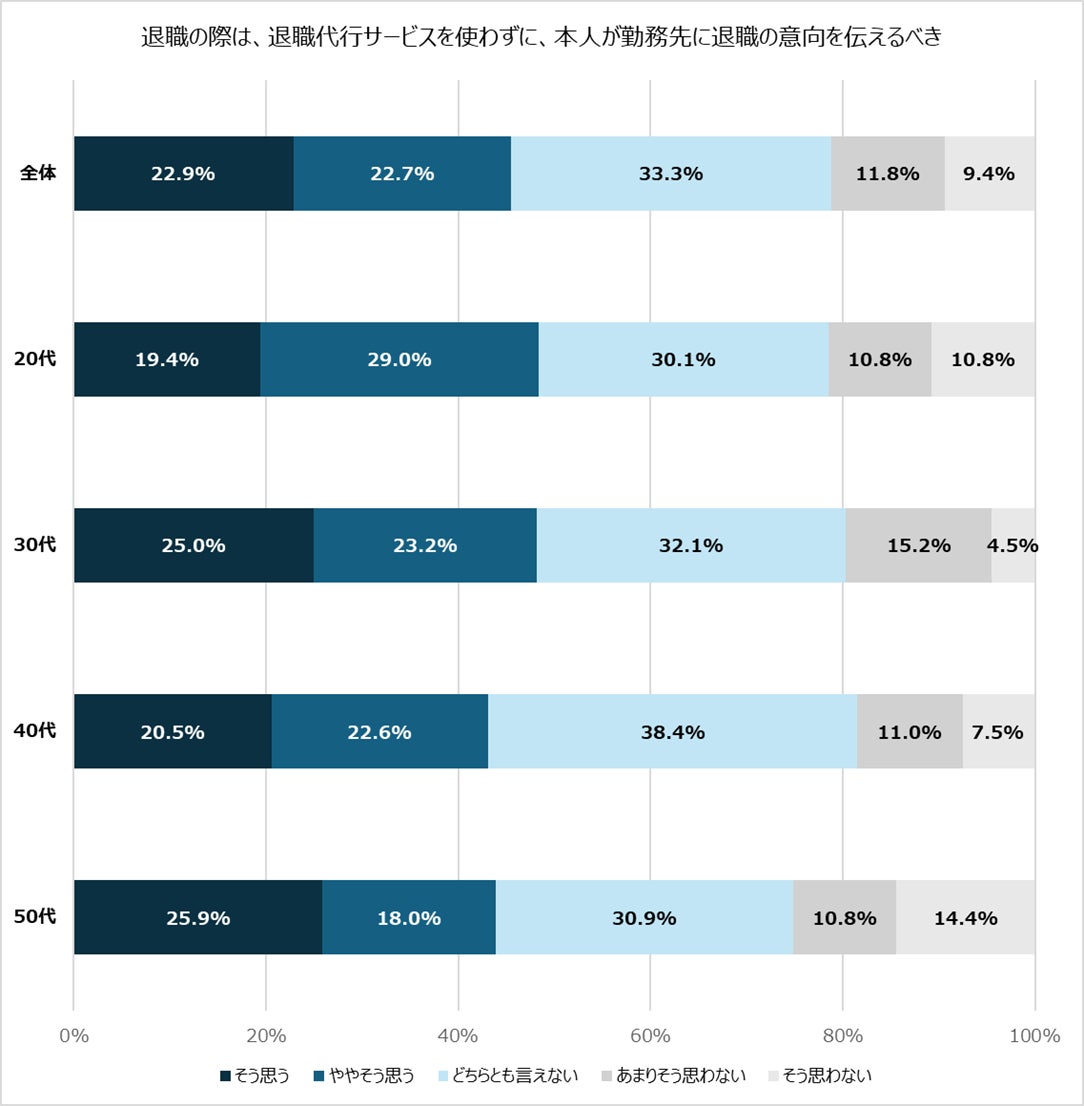 退職代行サービスは話題にはなっているものの、退職は本人が伝えるべきとの意見もあります。そこで、「退職の際は、退職代行サービスを使わずに、本人が勤務先に退職の意向を伝えるべき」についての考えを質問しました。